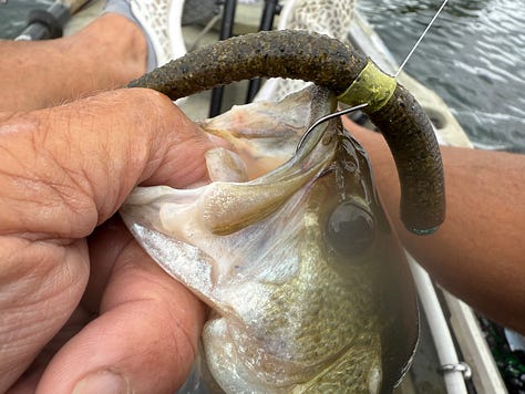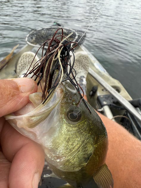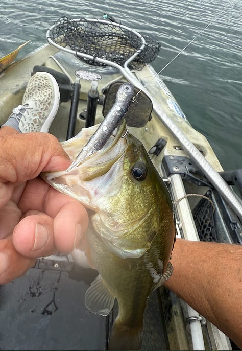 There is quite a bit of vegetation in the lake, especially in the water that was 3-8 feet. The Neko Rig worked great along with a Z-Man Shroomz Micro Finesse Jig, a ZMan Mini Max in bluegill, and a Hook Up baits soft plastic tube. I used my Little Miami Outfitters “Kayakjak's” Finesse Stick paired with a Shimano Vanford 2500 spinning reel spooled with 15 lb. Suffix 832 Neon braid and an 8 pound Seaguar leader.